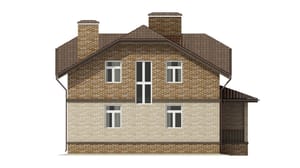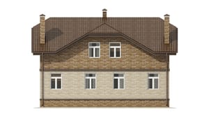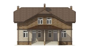 Простой, без лишних нагромождений дуплекс эконом-класса. Входная группа с крытым крыльцом обрамлена строгими колоннами и приглашает гостей пройти в дом. Таунхаус позволяет реализовать ваши идеи по использованию помещений. Он имеет пять жилых комнат, которые могут стать кабинетом, игровой комнатой или тренажерным залом. Простая форма и небольшая площадь помогут сэкономить значительные средства во время строительства и эксплуатации.